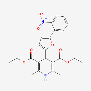 The mechanism of action of Diethyl 2,6-dimethyl-4-(5-(2-nitrophenyl)furan-2-yl)-1,4-dihydropyridine-3,5-dicarboxylate involves its interaction with specific molecular targets. In medicinal chemistry, it is known to interact with calcium channels, inhibiting calcium influx into cells. This action can lead to various physiological effects, such as vasodilation and reduced blood pressure. The molecular pathways involved include the modulation of intracellular calcium levels and the subsequent impact on cellular functions.
