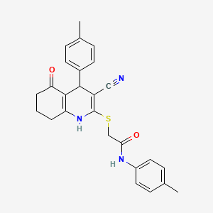2-{[3-cyano-4-(4-methylphenyl)-5-oxo-1,4,5,6,7,8-hexahydroquinolin-2-yl]sulfanyl}-N-(4-methylphenyl)acetamide is a complex organic compound with potential applications in various scientific fields. This compound features a quinoline core, a cyano group, and a sulfanyl-acetamide linkage, making it a subject of interest for researchers in chemistry, biology, and medicine.