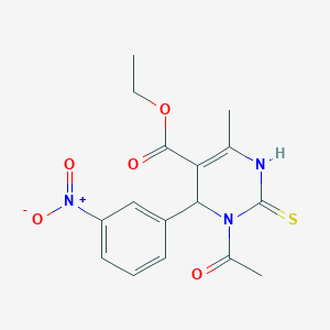 The mechanism of action of Ethyl 3-acetyl-6-methyl-4-(3-nitrophenyl)-2-thioxo-1,2,3,4-tetrahydropyrimidine-5-carboxylate is not fully understood, but it is believed to interact with various molecular targets, including enzymes and receptors. The presence of the nitrophenyl and thioxo groups suggests potential interactions with nucleophilic sites in biological molecules, leading to inhibition or modulation of enzyme activity. Further research is needed to elucidate the specific pathways and targets involved.