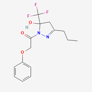 Uniqueness: 1-[5-hydroxy-3-propyl-5-(trifluoromethyl)-4,5-dihydro-1H-pyrazol-1-yl]-2-phenoxyethanone is unique due to its combination of functional groups, which confer specific chemical and biological properties. The presence of the trifluoromethyl group enhances its stability and reactivity, making it a valuable compound for various applications .