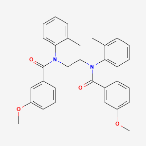 N,N'-Ethylenebis[3-methoxy-N-(O-tolyl)benzamide] is a bis-benzamide derivative characterized by an ethylene bridge connecting two benzamide moieties. Each benzamide unit is substituted with a methoxy group at the 3-position and an ortho-tolyl (o-tolyl) group on the nitrogen atom. For instance, ethylenebis(3,4,5-trimethoxybenzamide) (Exact Mass: 498.15, LogP: 4.17) shares a similar backbone but differs in substituent patterns .