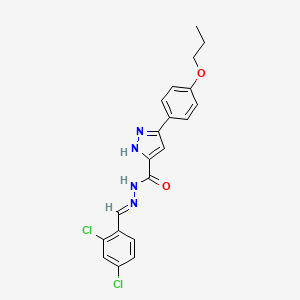 N'-[(E)-(2,4-dichlorophenyl)methylidene]-3-(4-propoxyphenyl)-1H-pyrazole-5-carbohydrazide is a synthetic organic compound that has garnered attention in medicinal chemistry due to its potential biological activities. This compound features a pyrazole ring and is characterized by its unique substitution patterns, which may contribute to its interaction with various biological targets.