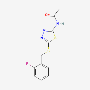 N-{5-[(2-fluorobenzyl)sulfanyl]-1,3,4-thiadiazol-2-yl}acetamide is a chemical compound that belongs to the class of thiadiazole derivatives This compound is characterized by the presence of a thiadiazole ring, which is a five-membered ring containing two nitrogen atoms and one sulfur atom