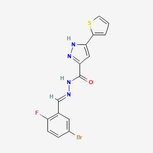 N'-(5-Bromo-2-fluorobenzylidene)-3-(thiophen-2-yl)-1H-pyrazole-5-carbohydrazide is a synthetic organic compound that has attracted attention in medicinal chemistry due to its potential biological activities. This compound incorporates a pyrazole core and a thiophene moiety, which are often associated with significant biological effects, including antimicrobial, anti-inflammatory, and anticancer properties.