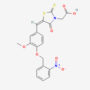 2-[(5E)-5-({3-Methoxy-4-[(2-nitrophenyl)methoxy]phenyl}methylidene)-4-oxo-2-sulfanylidene-1,3-thiazolidin-3-YL]acetic acid is a complex organic compound with a unique structure that includes a thiazolidine ring, a methoxy group, and a nitrophenyl group. This compound is of interest in various fields of scientific research due to its potential biological and chemical properties.