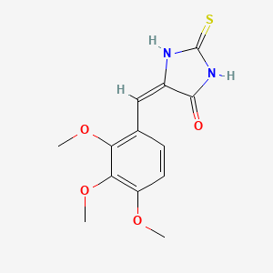 The synthesis of (5E)-2-sulfanylidene-5-[(2,3,4-trimethoxyphenyl)methylidene]imidazolidin-4-one typically involves the condensation of appropriate starting materials under controlled conditions. One common method involves the reaction of 2,3,4-trimethoxybenzaldehyde with thiourea in the presence of a base, followed by cyclization to form the imidazolidinone ring. The reaction conditions often require careful control of temperature and pH to ensure the desired product is obtained with high purity and yield.