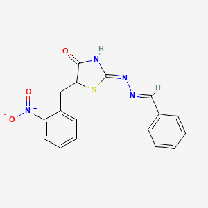 (2Z)-2-[(2E)-benzylidenehydrazinylidene]-5-(2-nitrobenzyl)-1,3-thiazolidin-4-one is a complex organic compound characterized by its unique structure, which includes a thiazolidinone ring, a benzylidenehydrazinylidene moiety, and a nitrobenzyl group