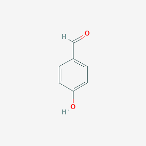 This compound (also known as p-hydroxybenzaldehyde or 4-formylphenol) is an organic compound with the chemical formula C₇H₆O₂.[1][2] It consists of a benzene (B151609) ring substituted with both a hydroxyl (-OH) group and an aldehyde (-CHO) group at the para (4) position.[1][3] This positioning of the functional groups imparts a unique reactivity profile, making it a valuable intermediate in a wide range of applications.[3][4] It serves as a crucial precursor in the synthesis of pharmaceuticals, fragrances, polymers, dyes, and agrochemicals.[1][5][6] For instance, it is a key intermediate in producing drugs like amoxicillin (B794) and trimethoprim, as well as fragrances such as vanillin (B372448) and raspberry ketone.[7][8] Naturally, this compound is found in various plants, including orchids like Gastrodia elata and in vanilla.[2][9]