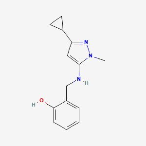 2-{[(3-Cyclopropyl-1-methyl-1H-pyrazol-5-yl)amino]methyl}phenol is a pyrazole-derived compound featuring a phenolic hydroxyl group and a cyclopropyl-substituted pyrazole core. Its structure combines aromaticity (phenol) with the steric and electronic effects of the cyclopropane ring, which may influence its physicochemical properties and intermolecular interactions, such as hydrogen bonding .