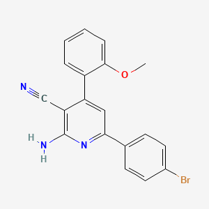 2-Amino-6-(4-bromophenyl)-4-(2-methoxyphenyl)nicotinonitrile is a compound belonging to the class of nicotinonitriles, characterized by its unique structural features that include amino, bromophenyl, and methoxyphenyl groups. This compound has garnered attention in scientific research due to its potential biological activities, particularly in the fields of medicinal chemistry and pharmacology.