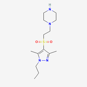 The synthesis of 1-(2-((3,5-Dimethyl-1-propyl-1H-pyrazol-4-yl)sulfonyl)ethyl)piperazine typically involves multi-step organic reactions. The initial step often includes the formation of the pyrazole ring through cyclocondensation reactions involving hydrazines and 1,3-diketones Industrial production methods may employ optimized reaction conditions, such as the use of specific catalysts and solvents, to enhance yield and purity .