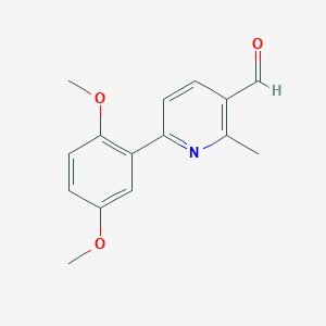 6-(2,5-Dimethoxyphenyl)-2-methylnicotinaldehyde is a nicotinaldehyde derivative featuring a 2,5-dimethoxyphenyl substituent at the 6-position of the pyridine ring and a methyl group at the 2-position. Its molecular formula is C₁₅H₁₅NO₃, with a molecular weight of 257.28 g/mol.