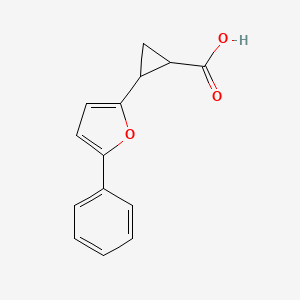 The mechanism of action of 2-(5-Phenylfuran-2-yl)cyclopropanecarboxylic acid involves its interaction with specific molecular targets. For example, it may act as an inhibitor of certain enzymes by binding to their active sites and preventing substrate access. The exact pathways involved depend on the specific application and target molecule.