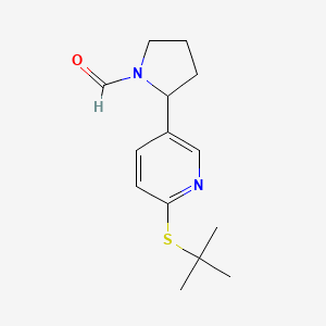 The mechanism of action of 2-(6-(tert-Butylthio)pyridin-3-yl)pyrrolidine-1-carbaldehyde involves its interaction with specific molecular targets. The pyrrolidine ring can interact with proteins and enzymes, potentially inhibiting or modulating their activity. The tert-butylthio group may enhance the compound’s lipophilicity, facilitating its passage through cell membranes and increasing its bioavailability .