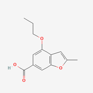 2-Methyl-4-propoxybenzofuran-6-carboxylic acid is a benzofuran derivative characterized by a methyl group at position 2, a propoxy chain at position 4, and a carboxylic acid moiety at position 5. The benzofuran core is a privileged structure in medicinal chemistry, often associated with bioactivity due to its aromatic and heterocyclic nature. The carboxylic acid group at position 6 provides a site for hydrogen bonding and salt formation, which may modulate solubility and intermolecular interactions in biological systems .