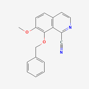 The synthesis of 8-(Benzyloxy)-7-methoxyisoquinoline-1-carbonitrile typically involves a series of chemical reactions starting from readily available precursors. One common synthetic route includes the nucleophilic substitution reaction of 8-hydroxyquinoline derivatives with benzyl halides under mild conditions . The reaction conditions often involve the use of a base such as potassium carbonate in a suitable solvent like dimethylformamide (DMF) to facilitate the substitution reaction. The resulting intermediate can then be further functionalized to introduce the methoxy and carbonitrile groups through additional steps involving methylation and cyanation reactions .