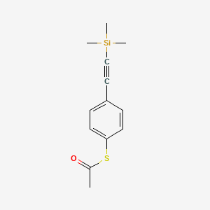 The mechanism of action of S-(4-((Trimethylsilyl)ethynyl)phenyl) ethanethioate involves its interaction with specific molecular targets. The trimethylsilyl group enhances the compound’s stability and facilitates its binding to target molecules. The ethynyl moiety allows for conjugation with other compounds, enabling the formation of complex structures. These interactions can modulate biological pathways and influence cellular processes .