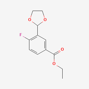 The synthesis of Ethyl 3-(1,3-dioxolan-2-yl)-4-fluorobenzoate typically involves the reaction of 4-fluorobenzoic acid with ethylene glycol in the presence of an acid catalyst to form the 1,3-dioxolane ring. This intermediate is then esterified with ethanol under acidic conditions to yield the final product .