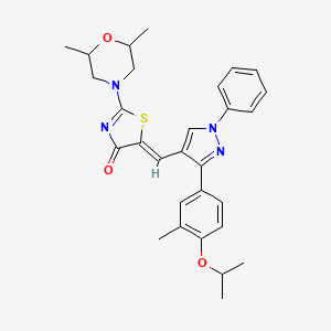 The compound (5Z)-2-(2,6-dimethyl-4-morpholinyl)-5-{[3-(4-isopropoxy-3-methylphenyl)-1-phenyl-1H-pyrazol-4-yl]methylene}-1,3-thiazol-4(5H)-one is a complex organic molecule with potential applications in various fields such as chemistry, biology, and medicine. This compound features a unique structure that includes a thiazole ring, a pyrazole ring, and a morpholine ring, making it an interesting subject for scientific research.