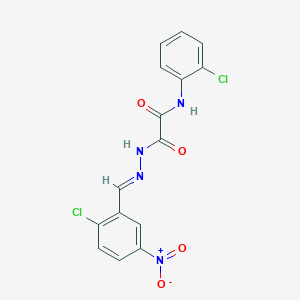 The mechanism of action of N’-[(E)-(2-chloro-5-nitrophenyl)methylideneamino]-N-(2-chlorophenyl)oxamide involves its interaction with specific molecular targets. The compound can bind to enzymes or receptors, inhibiting their activity and leading to various biological effects. The pathways involved in its mechanism of action are still under investigation, but it is believed to interfere with cellular processes such as signal transduction and gene expression.