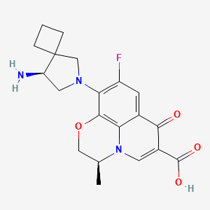 This compound (IUPAC name: (3S)-10-[(8S)-8-Amino-6-azaspiro[3.4]oct-6-yl]-9-fluoro-3-methyl-7-oxo-2,3-dihydro-7H-[1,4]oxazino[2,3,4-ij]quinoline-6-carboxylic acid) is a fluoroquinolone derivative with a novel spiroazetidine moiety. Its molecular formula is C₂₁H₂₄FN₃O₅, and it features a fused pyridobenzoxazine core, a fluorine atom at position 9, and a stereospecific spiroazetidine ring (6-azaspiro[3.4]octane) at position 10 . The compound exhibits antibacterial activity by inhibiting bacterial DNA gyrase and topoisomerase IV, with the (S)-configuration at C3 and C8 critical for efficacy .