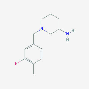 1-[(3-Fluoro-4-methylphenyl)methyl]piperidin-3-amine is a piperidine-based small molecule featuring a benzyl substituent with a fluorine atom at the 3-position and a methyl group at the 4-position of the phenyl ring. The piperidine ring’s 3-amine group and the substituted benzyl moiety suggest adaptability for interactions with biological targets, such as neurotransmitter receptors or enzymes.