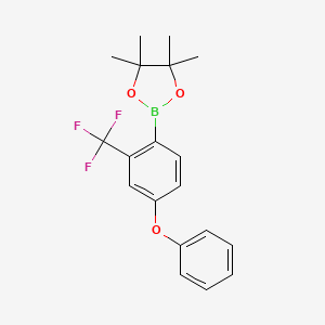 The mechanism of action of 4,4,5,5-Tetramethyl-2-(4-phenoxy-2-(trifluoromethyl)phenyl)-1,3,2-dioxaborolane in chemical reactions involves the formation of a boronate complex with a transition metal catalyst. This complex facilitates the transfer of the boronic ester group to the electrophilic partner, such as an aryl halide, in cross-coupling reactions. The presence of the phenoxy and trifluoromethyl groups can influence the reactivity and selectivity of the compound by stabilizing the transition state and intermediates.