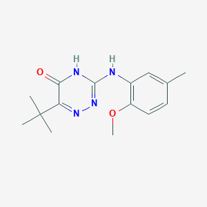 The mechanism of action of 6-(tert-butyl)-3-((2-methoxy-5-methylphenyl)amino)-1,2,4-triazin-5(4H)-one involves its interaction with specific molecular targets and pathways. The compound may exert its effects by binding to enzymes, receptors, or other biomolecules, thereby modulating their activity. The exact molecular targets and pathways can vary depending on the specific application and context of use.