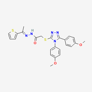 2-[[4,5-bis(4-methoxyphenyl)-1,2,4-triazol-3-yl]sulfanyl]-N-[(Z)-1-thiophen-2-ylethylideneamino]acetamide: is a fascinating compound with a complex structure. Let’s break it down: