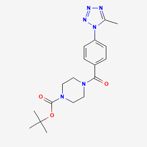tert-butyl 4-{[4-(5-methyl-1H-tetrazol-1-yl)phenyl]carbonyl}piperazine-1-carboxylate is a piperazine-based compound featuring a tert-butyl carbamate protecting group and a 5-methyltetrazole-substituted benzoyl moiety. This structure combines a piperazine scaffold—a common motif in medicinal chemistry for its conformational flexibility and hydrogen-bonding capabilities—with a tetrazole ring, which is often used as a bioisostere for carboxylic acids or other acidic groups due to its metabolic stability and polarity . The tert-butyl carbamate group enhances solubility and facilitates synthetic manipulation during multi-step reactions, as seen in analogous compounds .
