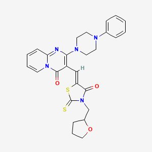 InChI=1S/C27H27N5O3S2/c33-25-21(17-22-26(34)32(27(36)37-22)18-20-9-6-16-35-20)24(28-23-10-4-5-11-31(23)25)30-14-12-29(13-15-30)19-7-2-1-3-8-19/h1-5,7-8,10-11,17,20H,6,9,12-16,18H2/b22-17- |