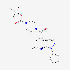 tert-butyl 4-[(1-cyclopentyl-6-methyl-1H-pyrazolo[3,4-b]pyridin-4-yl)carbonyl]piperazine-1-carboxylate is a structurally complex heterocyclic compound featuring a pyrazolo[3,4-b]pyridine core fused with a cyclopentyl group and a piperazine-carboxylate moiety. Its synthesis typically involves multi-step reactions, including palladium-catalyzed cross-coupling, cyclization, and functional group modifications, as observed in analogous compounds described in European patent applications (e.g., EP 3 768 669 B1) . The tert-butyl carbamate group enhances solubility and metabolic stability, making it a common pharmacophore in medicinal chemistry.