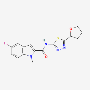 5-Fluoro-1-methyl-N-[5-(tetrahydrofuran-2-yl)-1,3,4-thiadiazol-2-yl]-1H-indole-2-carboxamide is a heterocyclic compound featuring a fluorinated indole core linked to a 1,3,4-thiadiazole ring via a carboxamide bridge. The indole moiety is substituted with a fluorine atom at the 5-position and a methyl group at the 1-position, enhancing its metabolic stability and lipophilicity .