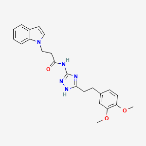 The compound N-{3-[2-(3,4-dimethoxyphenyl)ethyl]-1H-1,2,4-triazol-5-yl}-3-(1H-indol-1-yl)propanamide is a triazole-containing hybrid molecule featuring a 3,4-dimethoxyphenyl ethyl group and an indole-propanamide side chain. Its structure combines a 1,2,4-triazole core, known for diverse pharmacological activities (e.g., antimicrobial, anticancer), with substituted aromatic systems that modulate solubility and target interactions.