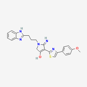 The mechanism of action of 1-[3-(1H-benzimidazol-2-yl)propyl]-5-imino-4-[4-(4-methoxyphenyl)-1,3-thiazol-2-yl]-2,5-dihydro-1H-pyrrol-3-ol involves its interaction with specific molecular targets, such as enzymes and receptors. The benzimidazole moiety is known to interact with DNA and proteins, potentially inhibiting their function . The thiazole and pyrrole rings contribute to the compound’s ability to form hydrogen bonds and hydrophobic interactions, enhancing its binding affinity and specificity .