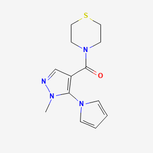 The mechanism of action of 4-[1-methyl-5-(1H-pyrrol-1-yl)-1H-pyrazole-4-carbonyl]thiomorpholine involves its interaction with specific molecular targets and pathways. The compound can bind to enzymes and receptors, modulating their activity and leading to various biological effects. For example, it may inhibit certain enzymes involved in inflammatory pathways, thereby reducing inflammation. The exact molecular targets and pathways depend on the specific application and context in which the compound is used.