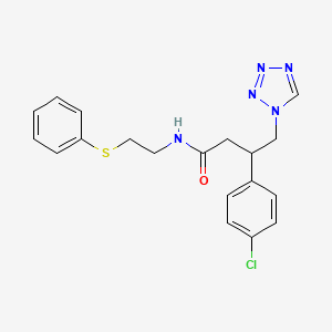 The mechanism of action of 3-(4-chlorophenyl)-N-[2-(phenylsulfanyl)ethyl]-4-(1H-tetrazol-1-yl)butanamide would depend on its specific biological target. It could interact with enzymes or receptors, modulating their activity and leading to various physiological effects. The tetrazole ring is known to mimic carboxylate groups, potentially allowing the compound to inhibit enzymes that recognize carboxylate substrates.