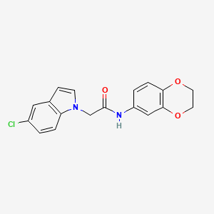 The mechanism of action of 2-(5-chloro-1H-indol-1-yl)-N-(2,3-dihydro-1,4-benzodioxin-6-yl)acetamide involves its interaction with specific molecular targets, such as enzymes or receptors. The indole moiety may interact with tryptophan-binding proteins, while the benzodioxin moiety could modulate oxidative stress pathways.