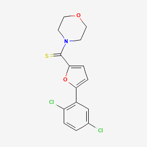 5-(2,5-Dichlorophenyl)furan-2-ylmethanethione is a sulfur-containing heterocyclic compound featuring a dichlorophenyl-substituted furan core linked to a morpholine moiety via a methanethione group. The compound’s key structural elements include: