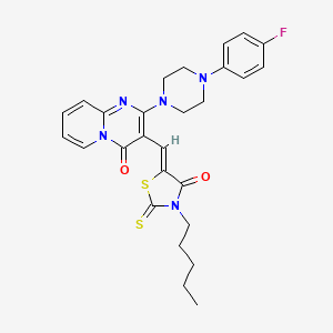 The synthesis of 2-[4-(4-fluorophenyl)piperazin-1-yl]-3-[(Z)-(4-oxo-3-pentyl-2-thioxo-1,3-thiazolidin-5-ylidene)methyl]-4H-pyrido[1,2-a]pyrimidin-4-one typically involves multiple steps, starting from readily available starting materials. The key steps include the formation of the pyrido[1,2-a]pyrimidin-4-one core, followed by the introduction of the piperazine and thiazolidinone groups. The reaction conditions often involve the use of strong bases, such as sodium hydride, and polar aprotic solvents, such as dimethylformamide (DMF), to facilitate the nucleophilic substitution reactions.