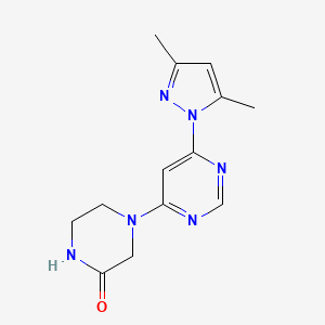 4-[6-(3,5-dimethyl-1H-pyrazol-1-yl)pyrimidin-4-yl]piperazin-2-one is a heterocyclic compound that features a pyrazole ring fused to a pyrimidine ring, with a piperazine moiety attached. This compound is of interest due to its potential biological activities and applications in various fields such as medicinal chemistry and pharmacology.