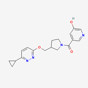 5-(3-{[(6-Cyclopropylpyridazin-3-yl)oxy]methyl}pyrrolidine-1-carbonyl)pyridin-3-ol is a complex organic compound that features a pyrrolidine ring, a pyridazinyl group, and a pyridin-3-ol moiety. This compound is of interest due to its potential pharmacological properties and its role as a building block in medicinal chemistry.