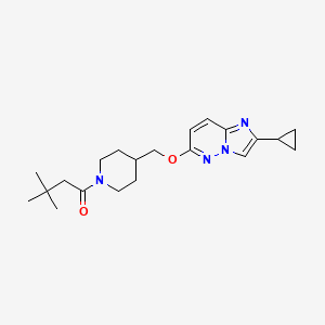 1-{4-[({2-Cyclopropylimidazo[1,2-b]pyridazin-6-yl}oxy)methyl]piperidin-1-yl}-3,3-dimethylbutan-1-one is a synthetic compound that has garnered attention in the field of medicinal chemistry. This compound is characterized by its unique structure, which includes a cyclopropyl group, an imidazo[1,2-b]pyridazine moiety, and a piperidine ring. It has shown potential in various scientific research applications, particularly in the development of kinase inhibitors.