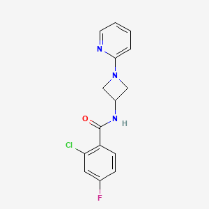 2-chloro-4-fluoro-N-[1-(pyridin-2-yl)azetidin-3-yl]benzamide is a complex organic compound that features a benzamide core substituted with chloro and fluoro groups, along with a pyridinyl azetidine moiety. This compound is of significant interest in medicinal chemistry due to its potential biological activities and applications in drug development.