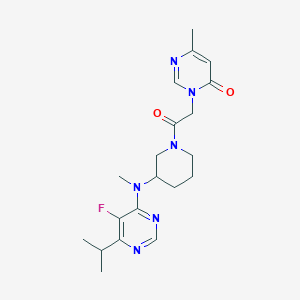 3-2-(3-{[5-Fluoro-6-(propan-2-yl)pyrimidin-4-ylamino}piperidin-1-yl)-2-oxoethyl]-6-methyl-3,4-dihydropyrimidin-4-one is a complex organic compound with a unique structure that includes a pyrimidine ring, a piperidine ring, and various functional groups. This compound is of significant interest in medicinal chemistry due to its potential biological activities and applications in drug development.