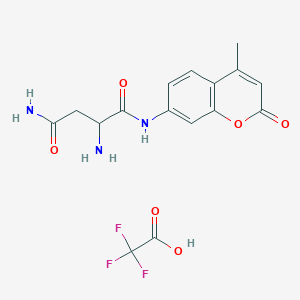 The mechanism of action of L-Asparagine 7-amido-4-methylcoumarin trifluoroacetate involves its interaction with specific molecular targets. The compound acts as a substrate for certain enzymes, leading to the release of 7-amido-4-methylcoumarin, which is fluorescent. This fluorescence can be measured to monitor enzyme activity and other biochemical processes.