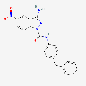 The mechanism of action of 3-Amino-N-(4-benzylphenyl)-5-nitro-1H-indazole-1-carboxamide involves its interaction with specific molecular targets and pathways. It is known to inhibit certain enzymes and signaling pathways, leading to its biological effects. For instance, it may inhibit cell growth by interfering with DNA synthesis or inducing apoptosis in cancer cells .