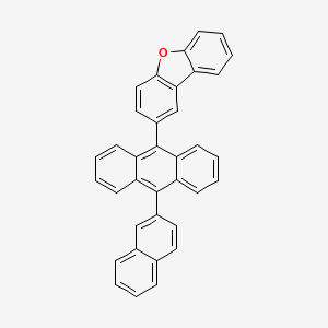 2-(10-(Naphthalen-2-yl)anthracen-9-yl)dibenzo[b,d]furan (CAS: 1226809-67-1) is a polycyclic aromatic hydrocarbon (PAH) derivative combining anthracene, naphthalene, and dibenzofuran moieties. Its structure features a central anthracene core substituted at the 9-position with a naphthalen-2-yl group and at the 10-position with a dibenzo[b,d]furan unit. This design enhances π-conjugation and electronic delocalization, making it a promising candidate for organic light-emitting diodes (OLEDs), particularly as a blue emitter. The compound is synthesized via Suzuki-Miyaura cross-coupling reactions, ensuring precise control over its molecular architecture .