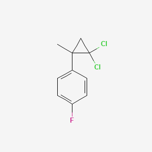 The synthesis of 1-(2,2-Dichloro-1-methylcyclopropyl)-4-fluorobenzene typically involves the cyclopropanation of a suitable precursor, followed by chlorination and fluorination steps. One common method involves the reaction of 4-fluorobenzyl chloride with 2,2-dichloro-1-methylcyclopropane under specific conditions to yield the desired product. The reaction conditions often include the use of a strong base, such as sodium hydride, and an appropriate solvent, like dimethylformamide (DMF), to facilitate the reaction.