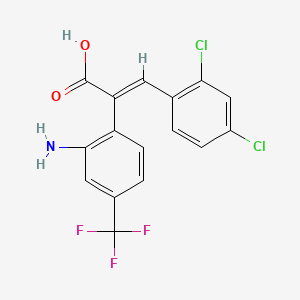 (E)-2-[2-amino-4-(trifluoromethyl)phenyl]-3-(2,4-dichlorophenyl)prop-2-enoic acid is unique due to the presence of both trifluoromethyl and dichloro substituents, which can significantly influence its chemical reactivity and biological activity. These substituents can enhance the compound’s stability, lipophilicity, and ability to interact with biological targets.